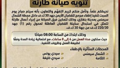 أعلنت وزارة الكهرباء بالحكومة المكلفة من مجلس النواب،صباح اليوم السبت، قطع التيار الكهربائي عن مناطق عدة في مدينة بنغازي لإجراء…