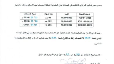 أعلن مصرف ليبيا المركزي عن إصدار صكوك مضاربة قابلة للاكتتاب بقيمة إجمالية تبلغ 10 ملايين دينار ليبي، موجهة للمكتتبين وفق…