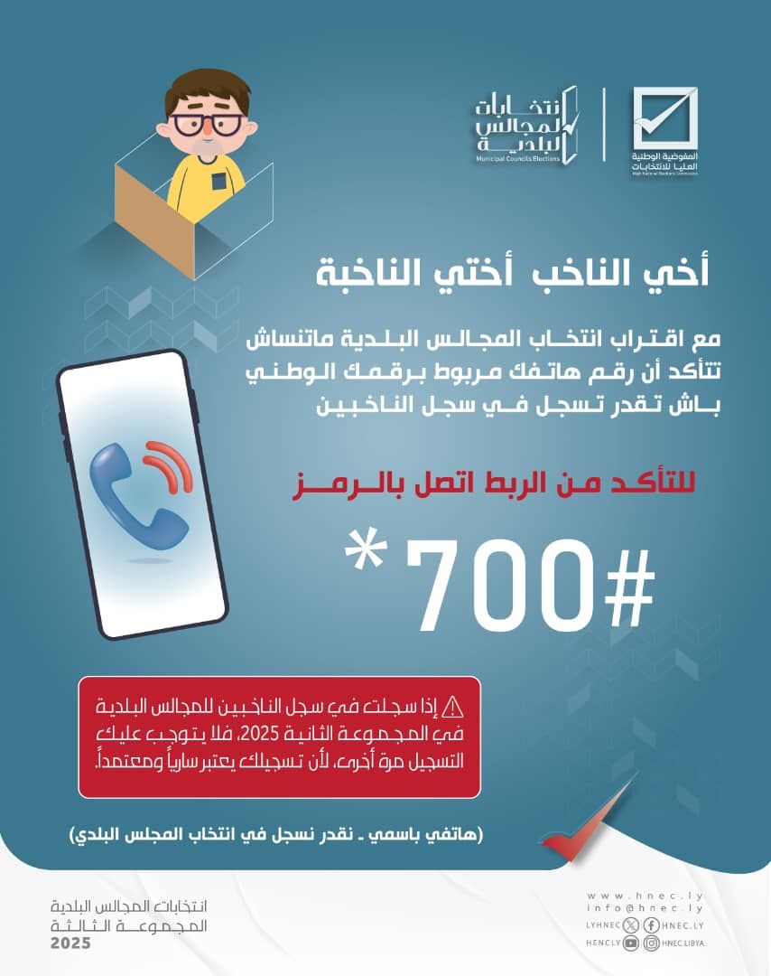 وطالبت المفوضية عبر موقعها الالكتروني كافة المواطنين في هذه البلديات بضرورة التأكد من ربط أرقام هواتفهم الوطنية عبر الاتصال بالرمز *700# لضمان إمكانية التسجيل والمشاركة في العملية الانتخابية.