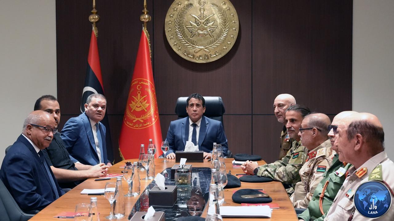 أفاد المكتب الإعلامي للمجلس للرئاسي : أن رئيس المجلس – القائد الأعلى للجيش الليبي، محمد المنفي، ترأس صباح اليوم الأحد، اجتماعاً موسعاً بالعاصمة طرابلس مع كلاً من، رئيس حكومة الوحدة الوطنية – وزير الدفاع، عبد الحميد الدبيبة، ووكيل وزارة الدفاع لشؤون المناطق العسكرية، عبد السلام زوبي، ورئيس الأركان العامة فريق أول ركن، محمد الحداد، ومعاون رئيس الأركان، وآمر المنطقة العسكرية الوسطى، ورئيس أركان القوات البرية، ورئيس هيئة العمليات، ومدير مكتب القائد الأعلى، ومدير مكتب وزير الدفاع.