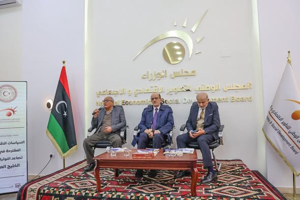 المجلس الوطني للتطوير الاقتصادي والاجتماعي أمس الاربعاء جلسة حوارية بعنوان: (السياسات المالية المقترحة في ظل تصاعد التوترات في منطقة الخليج العربي وانعكاساتها على أسواق النفط العالمية والإيرادات العامة للدولة الليبية) وبمشاركة رئيس اللجنة الاقتصادية بالمجلس الأعلى للدولة ” عبدالمطلب علي بقص ” ، ورئيس اللجنة القانونية بالمجلس ” عادل كرموس ” ، وعضو اللجنة الاقتصادية بالمجلس ” سعد بن شرادة ” ، في جلسة حوارية