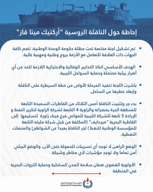 أعلنت المؤسسة الوطنية للنفط تشكيل لجنة فنية متخصصة، تحت مظلة حكومة الوحدة الوطنية، تضم الجهات المعنية، وذلك للتعامل مع وضع الناقلة الروسية “أركتيك ميتا قاز”، واتخاذ إجراءات عاجلة لحماية السواحل الليبية من أي أضرار بيئية محتملة.