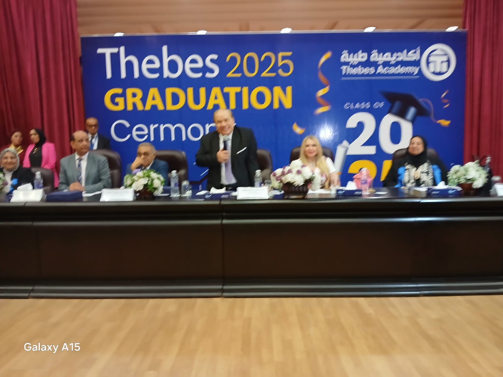 شهد حفل التخرج الاول حضور الأستاذ الدكتور صديق عفيفى رئيس مجلس إدارة أكاديمية طيبة وقد جلس بجواره على المنصة الاستاذ الدكتور صفوت النحاس مدير المجلس الوطني للتدريب والتعليم كما ضمت المنصة أيضا الأستاذة الدكتورة سوزان أبو العينين عميد معهد طيبة العالى للحاسب والعلوم الإدارية والأستاذة الدكتورة راندا حسن عميدة معهد طيبة العالى للهندسة والأستاذة شاه شاكر مستشار أكاديمية طيبة التعليمية