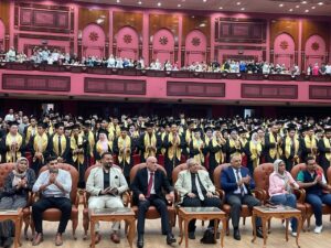 وحشد كبير من الخريجين وأولياء الأمور وأعضاء هيئة التدريس والهيئة العامة ومديرى الإدارات بالأكاديمية وبحضور الاستاذ شريف حمدان الأمين العام للأكاديمية والدكتور طارق منصور مدير معهد المقاولون العرب