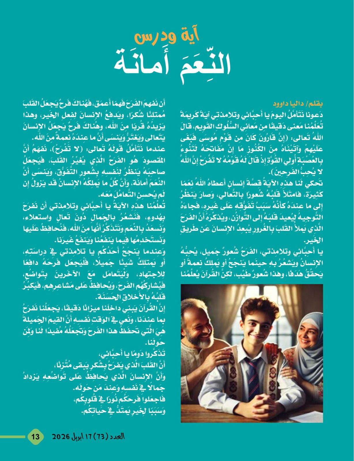 وتضمنت فقرة آية ودرس موضوع جديد بعنوان (النعم أمانة)