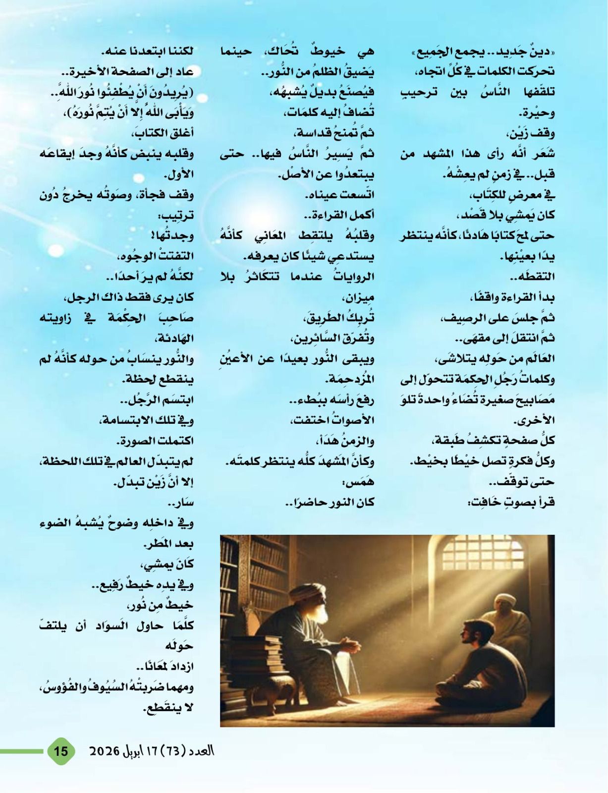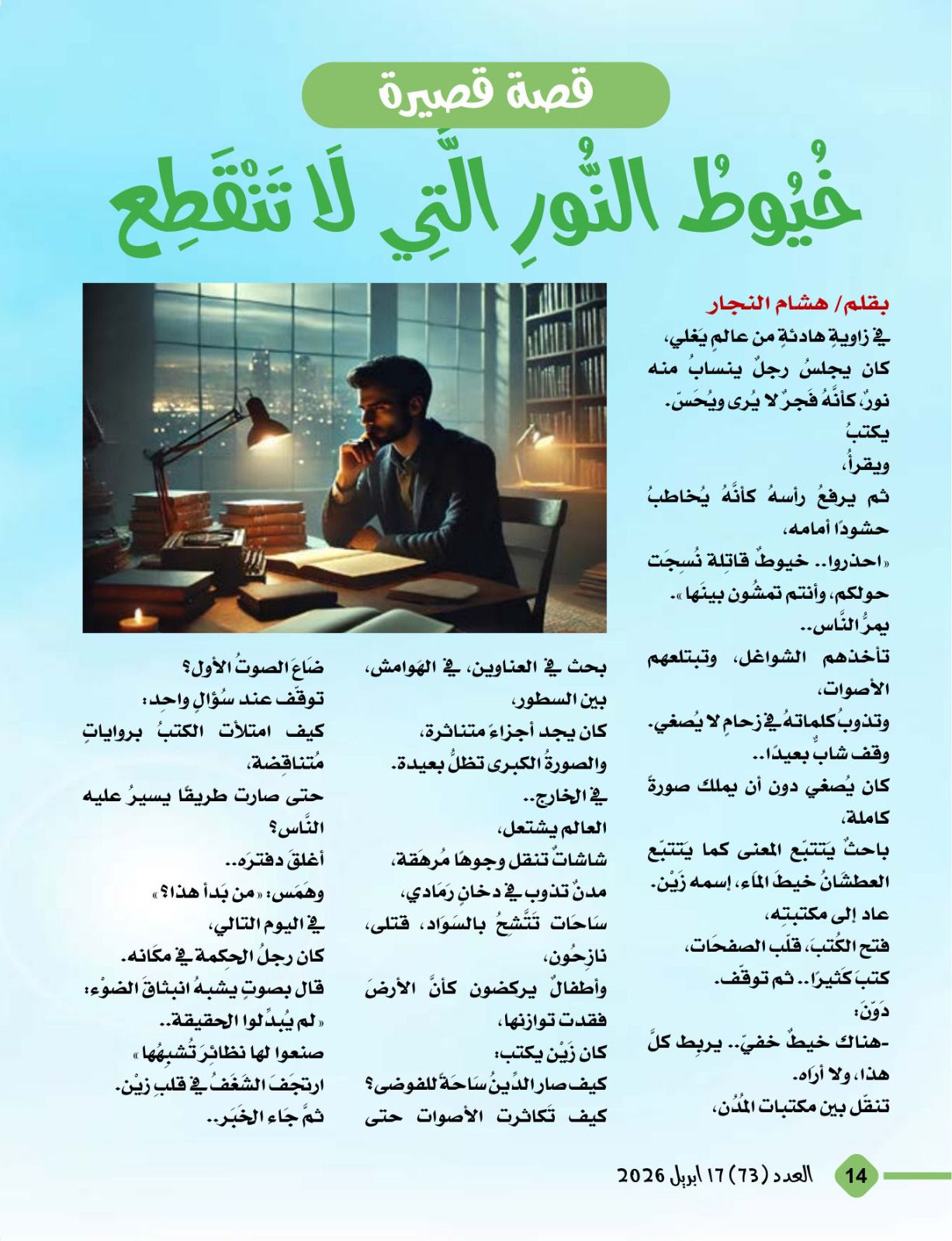 وبفقرة قصة قصيرة قصة جديدة بقلم رئيس مجلس تحرير المجلة الكاتب الصحفي والأديب هشام النجار بعنوان (خيوط النور التي لا تنقطع)