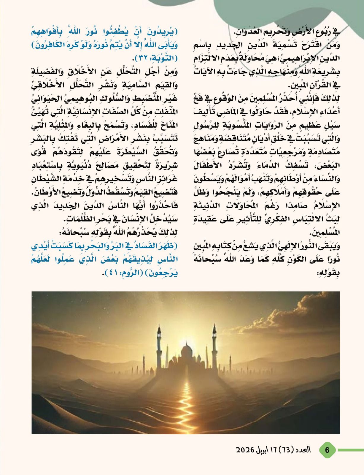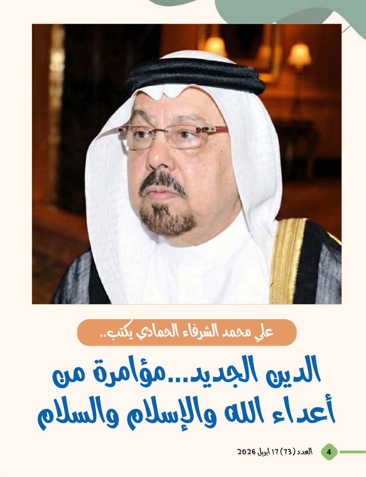 تصدر العدد مقال الكاتب والمفكر الكبير الأستاذ علي محمد الشرفاء الحمادي بعنوان (الدين الجديد.. مؤامرة من أعداء الله والإسلام والسلام)