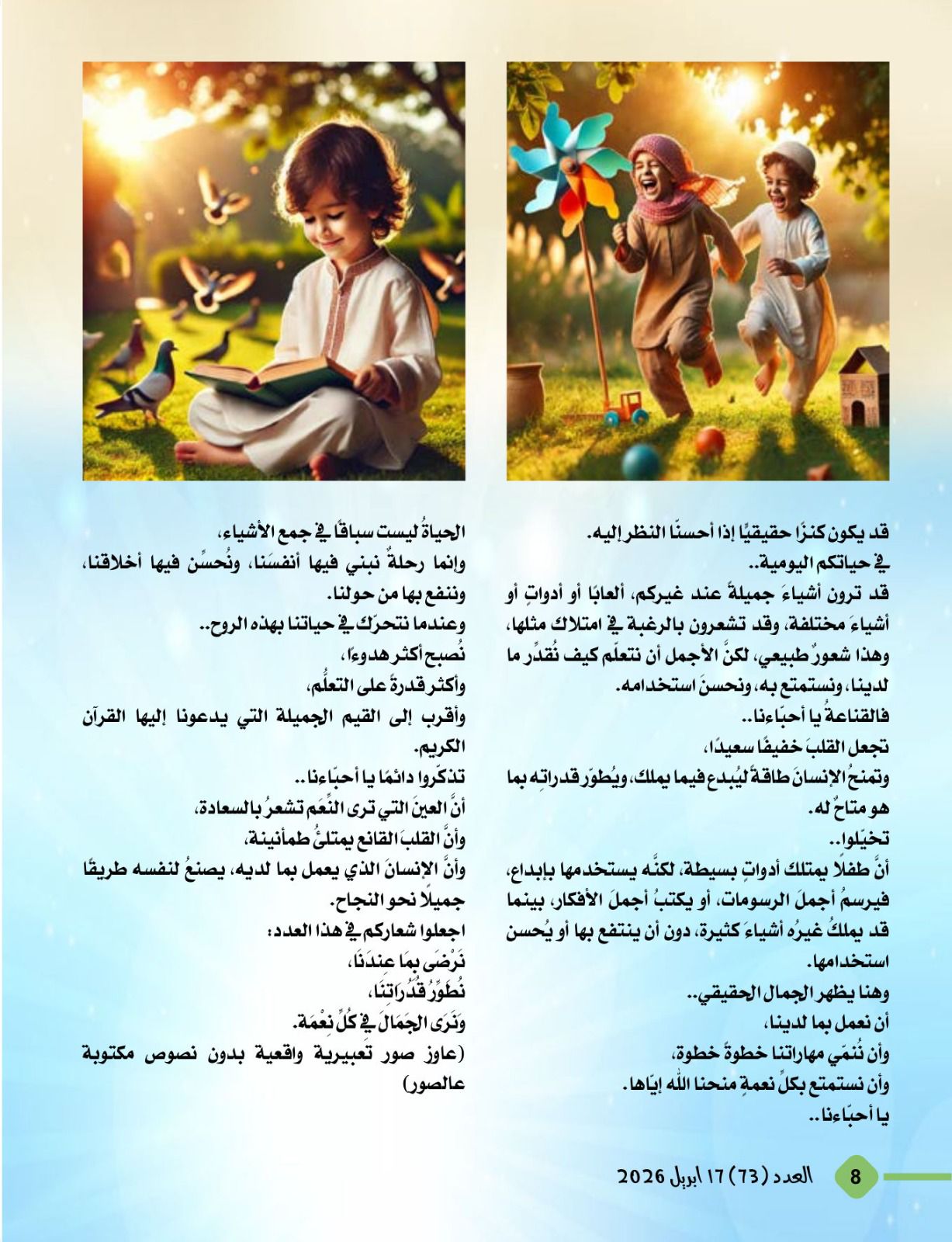 بفقرة أطفالنا أحبابنا وموضوع جديد بقلم رئيس مجلس تحرير المجلة بعنوان (قلوب قانعة وعيون تبصر الجمال)