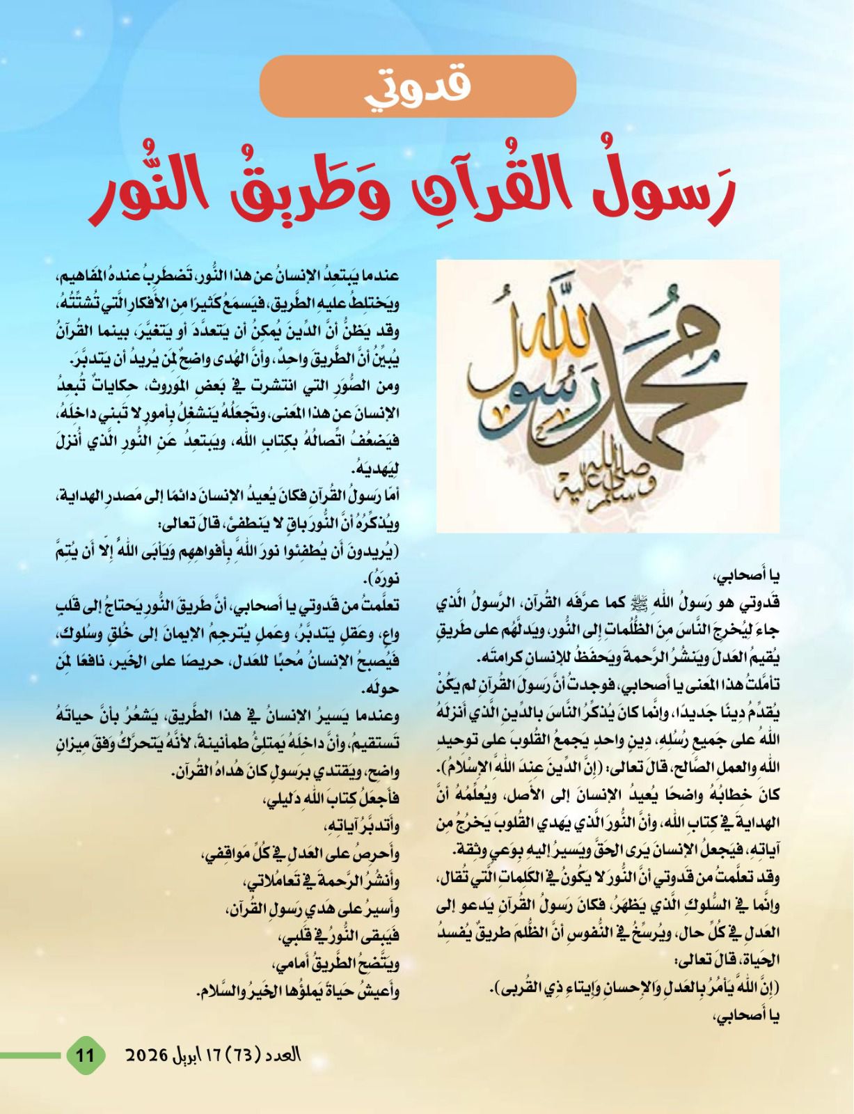 وتضمنت فقرة قدوتي موضوع بعنوان (رسول القرآن وطريق النور)