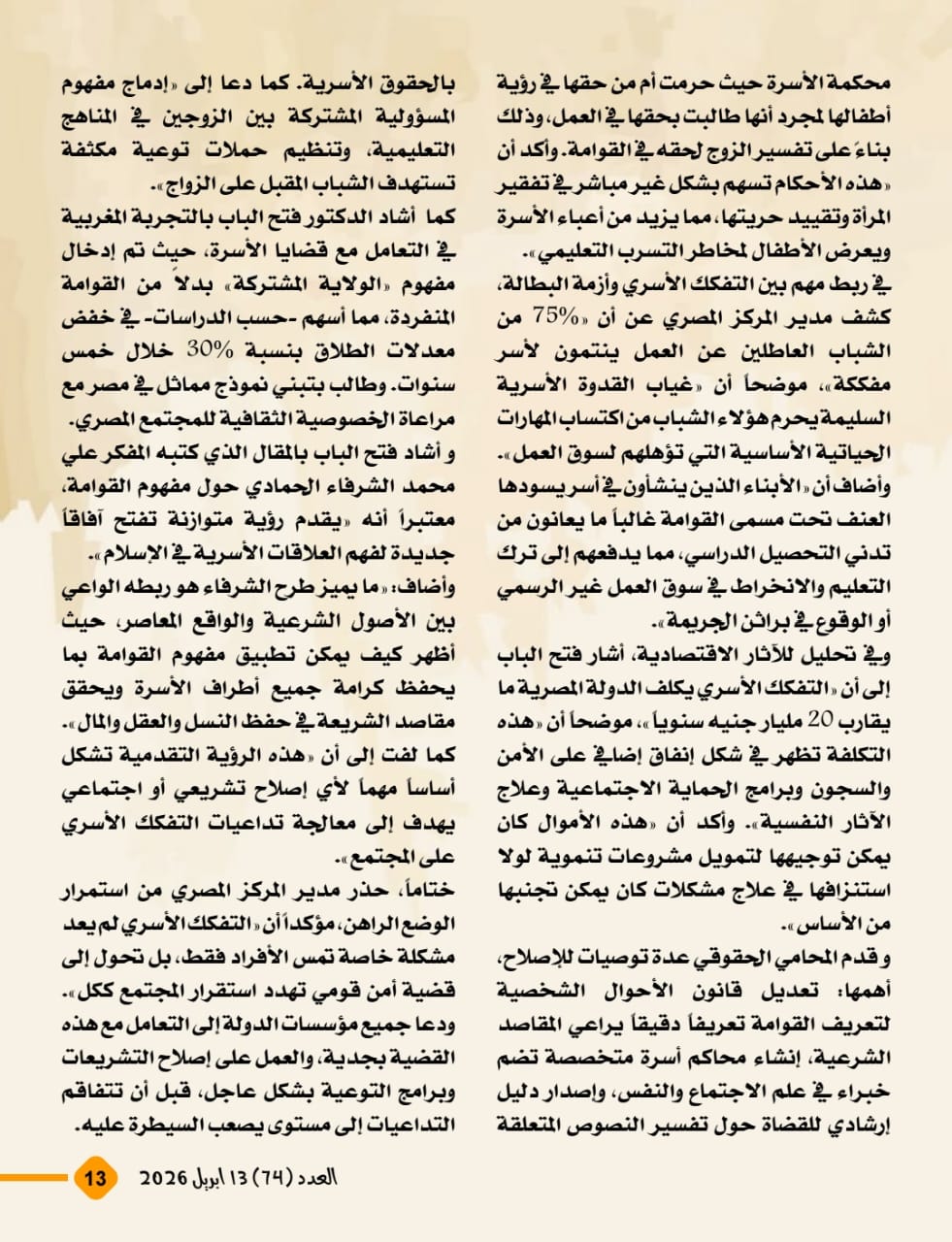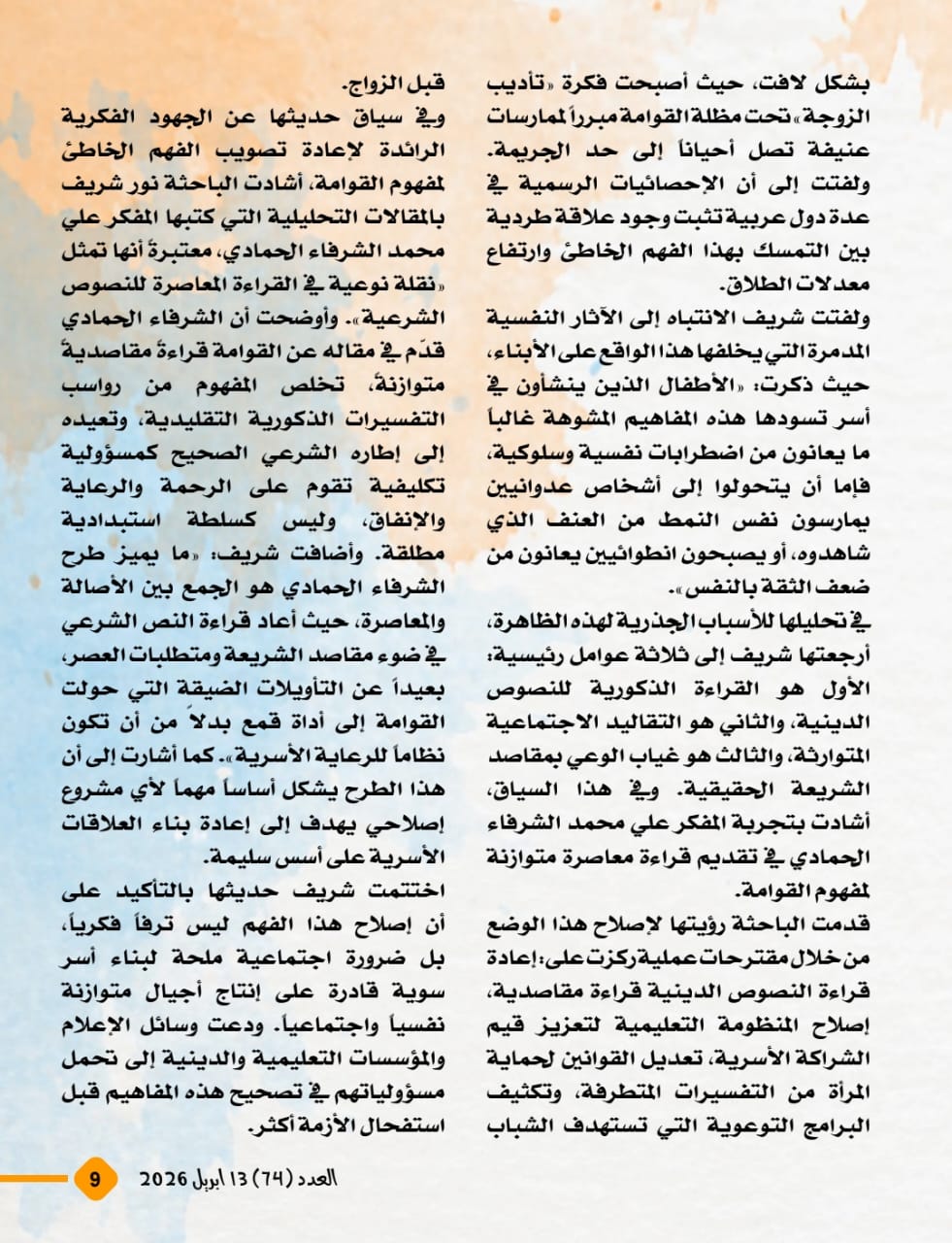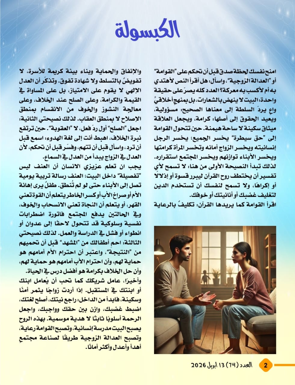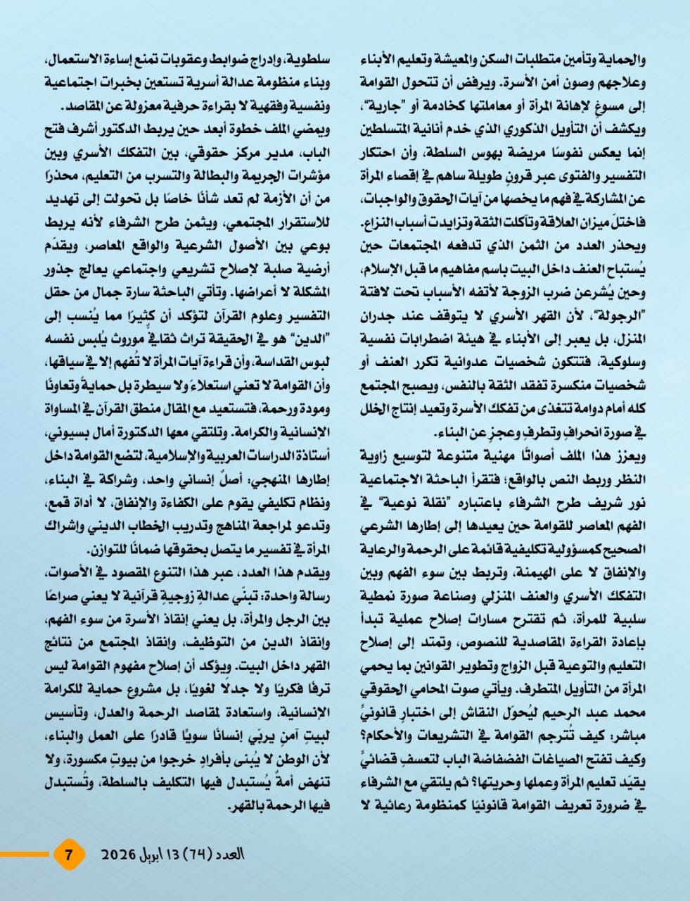 ويركّز ملف العدد على إعادة قراءة آية القوامة بوصفها منظومة رعاية لا رئاسة، ويربط بين العنف الأسري وتداعياته النفسية على الأطفال، وما ينعكس عنه من اضطرابات سلوكية تهدد الاستقرار المجتمعي. كما يدعم العدد أطروحته بتنوعٍ عبر قراءات اجتماعية وقانونية وتفسيرية تُترجم الفكرة إلى مسارات إصلاح عملية تشمل الوعي قبل الزواج، وتطوير المناهج، وضبط الصياغات القانونية لمنع التعسف، وتفعيل آليات حماية الأسرة والكرامة الإنسانية.
