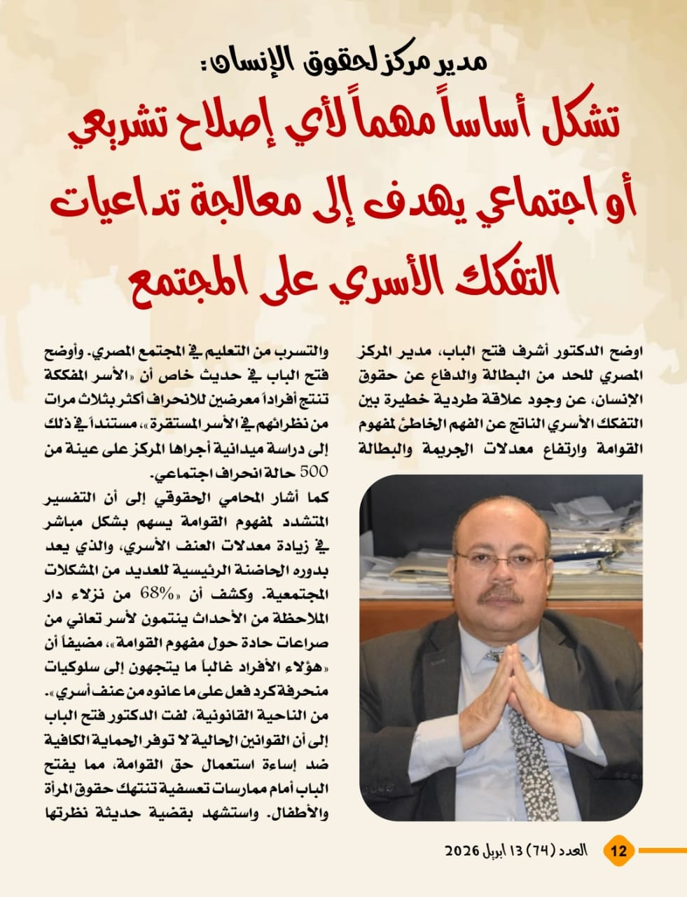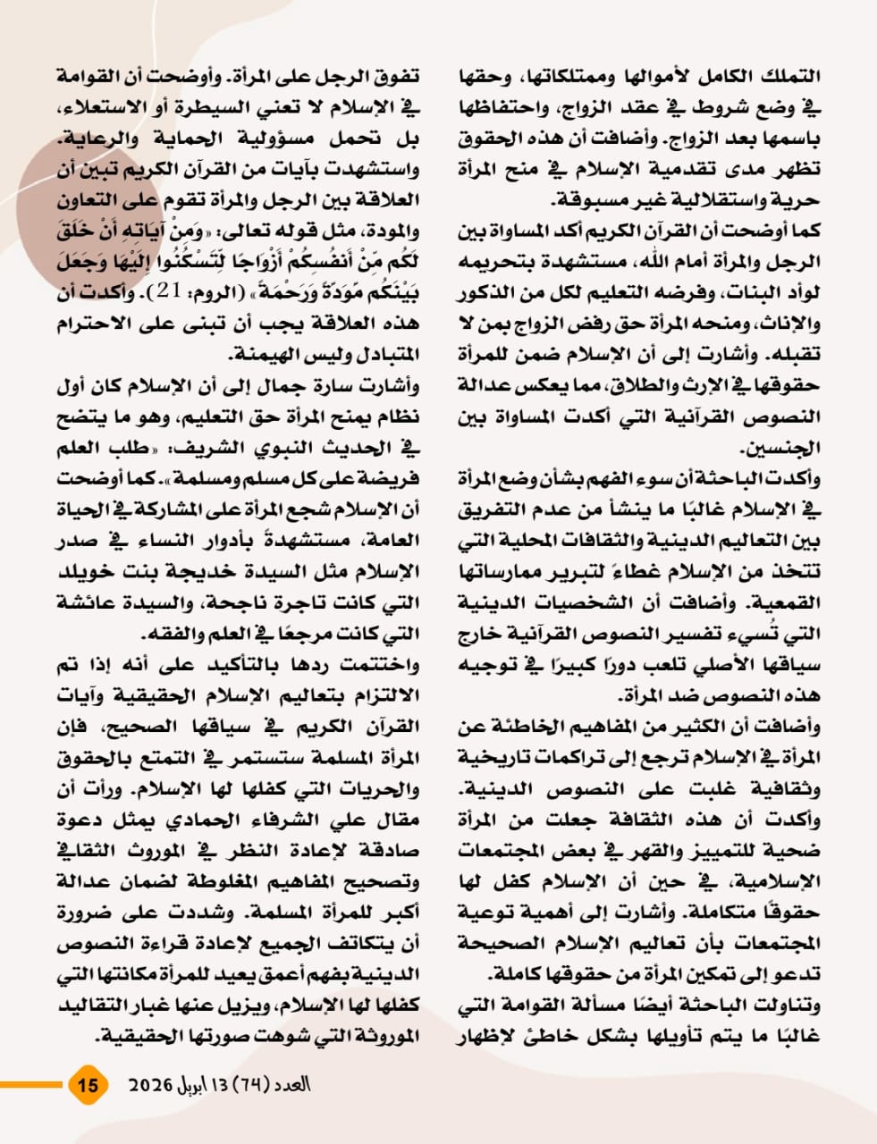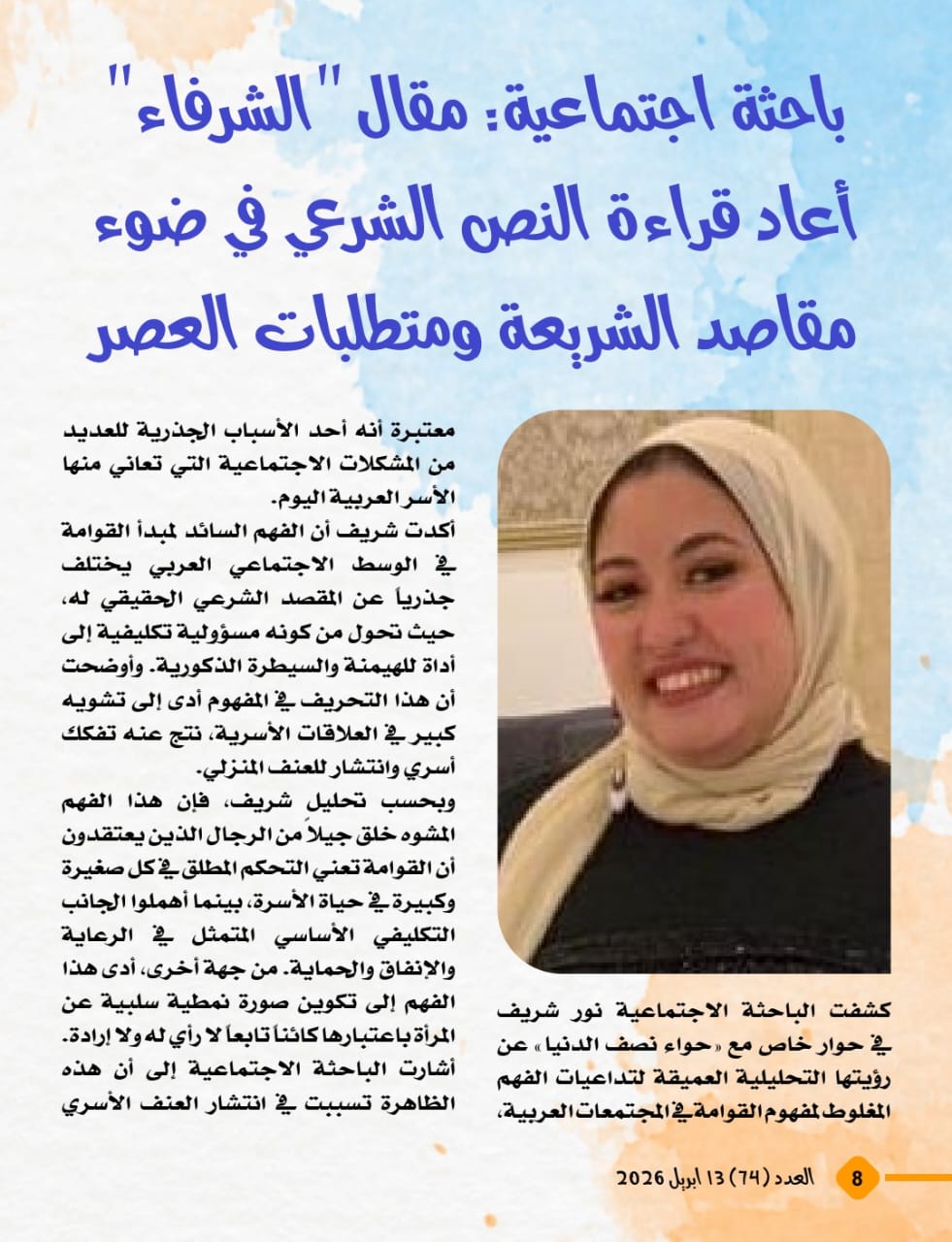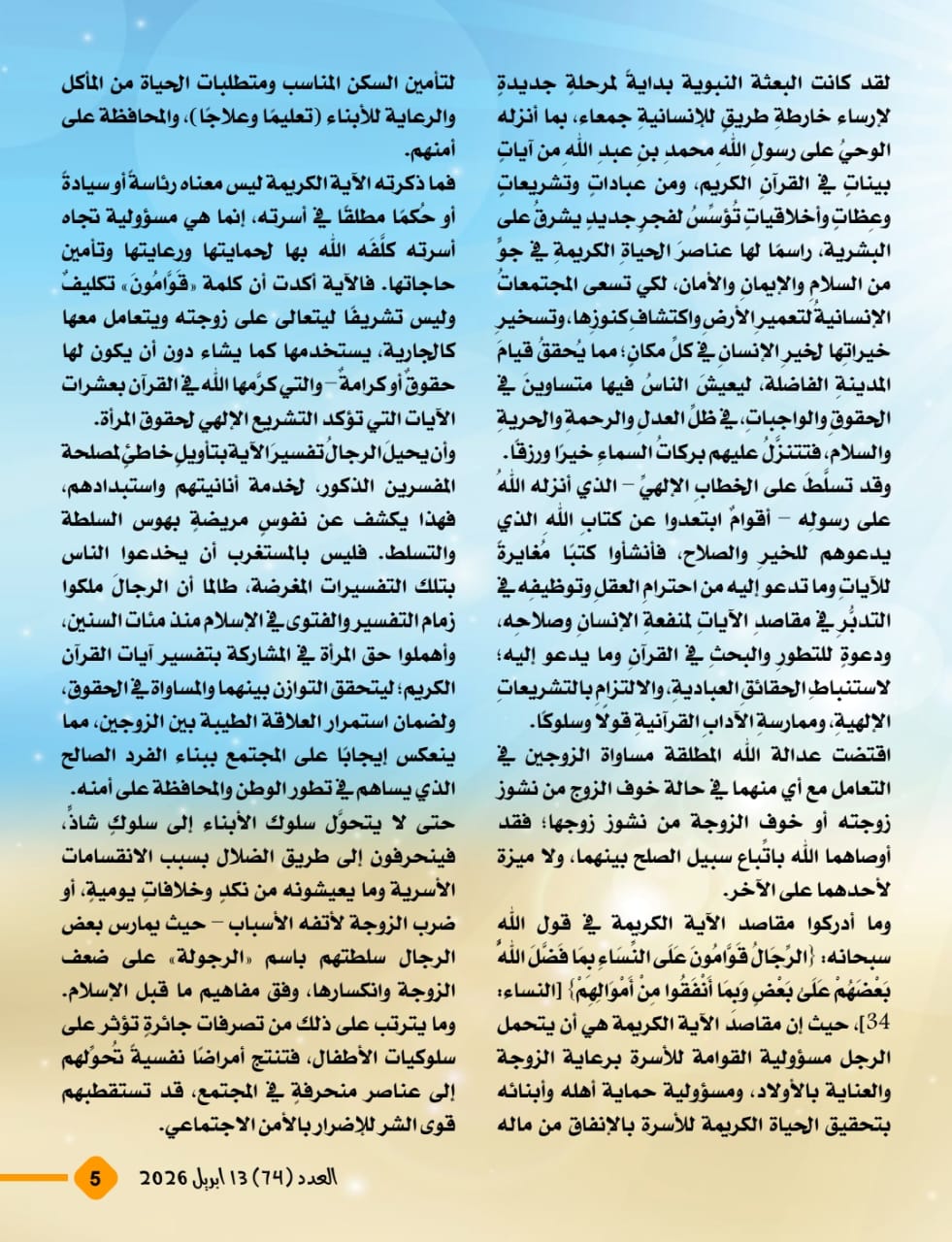 ويركّز ملف العدد على إعادة قراءة آية القوامة بوصفها منظومة رعاية لا رئاسة، ويربط بين العنف الأسري وتداعياته النفسية على الأطفال، وما ينعكس عنه من اضطرابات سلوكية تهدد الاستقرار المجتمعي. كما يدعم العدد أطروحته بتنوعٍ عبر قراءات اجتماعية وقانونية وتفسيرية تُترجم الفكرة إلى مسارات إصلاح عملية تشمل الوعي قبل الزواج، وتطوير المناهج، وضبط الصياغات القانونية لمنع التعسف، وتفعيل آليات حماية الأسرة والكرامة الإنسانية.
