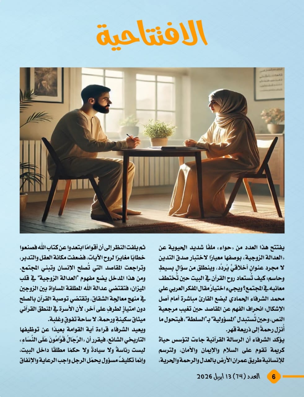 ويؤكد العدد في رسالته الختامية أن تبنّي عدالة زوجية قرآنية لا يعني صراعًا بين الرجل والمرأة، بل يعني إنقاذ الأسرة من سوء الفهم، وإنقاذ الدين من التوظيف، وبناء بيت آمن يربّي إنسانًا سويًا قادرًا على العمل والبناء.