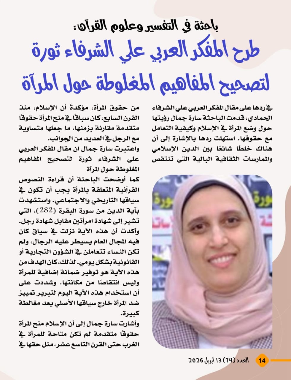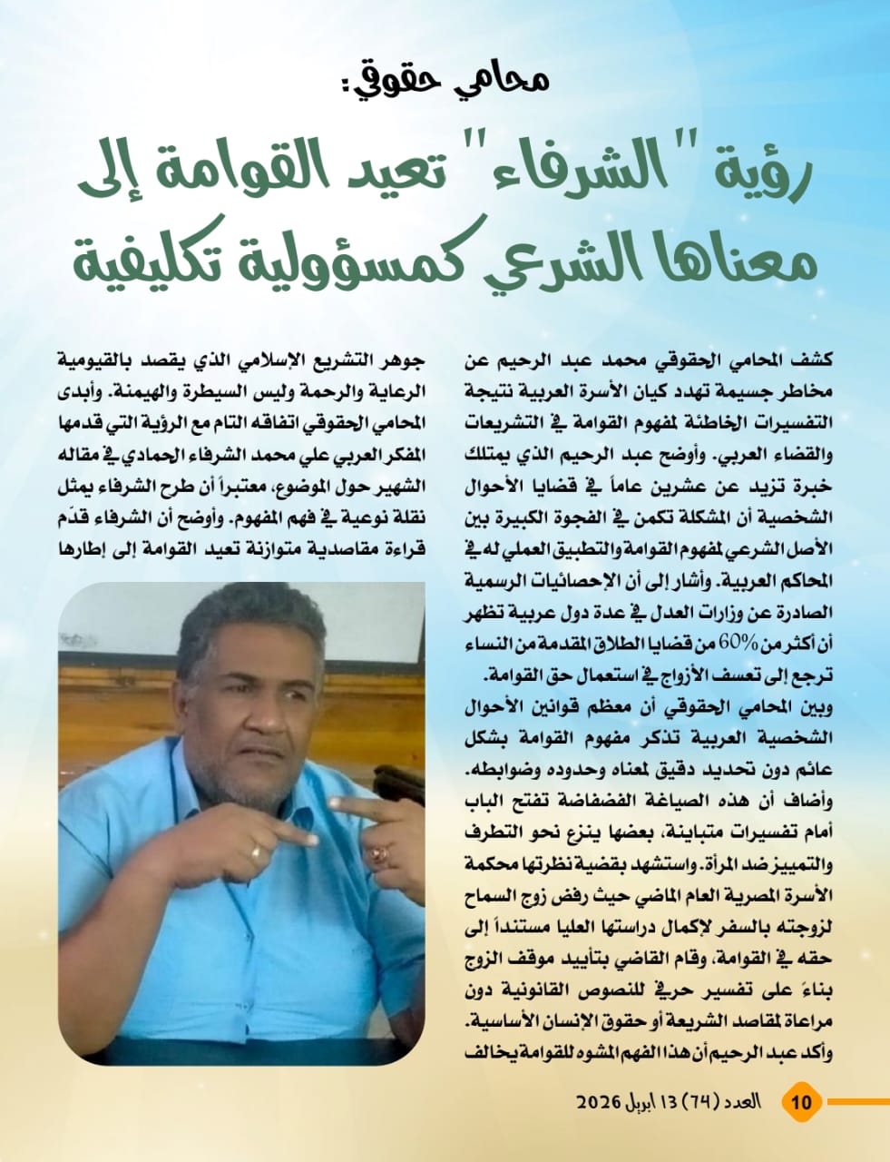 ويضع العدد أطروحته المركزية عبر قراءة المفكر العربي الأستاذ علي محمد الشرفاء الحمادي التي تعيد ضبط المفاهيم المؤسسة للعلاقة الزوجية على مرجعية القرآن ومقاصده، حيث يحذر من انحرافات التأويل حين تُستبدل “المسؤولية” بـ“السلطة” فتتحول القوامة إلى ذريعة قهر بدل أن تكون تكليفًا بالرعاية والحماية والإنفاق.