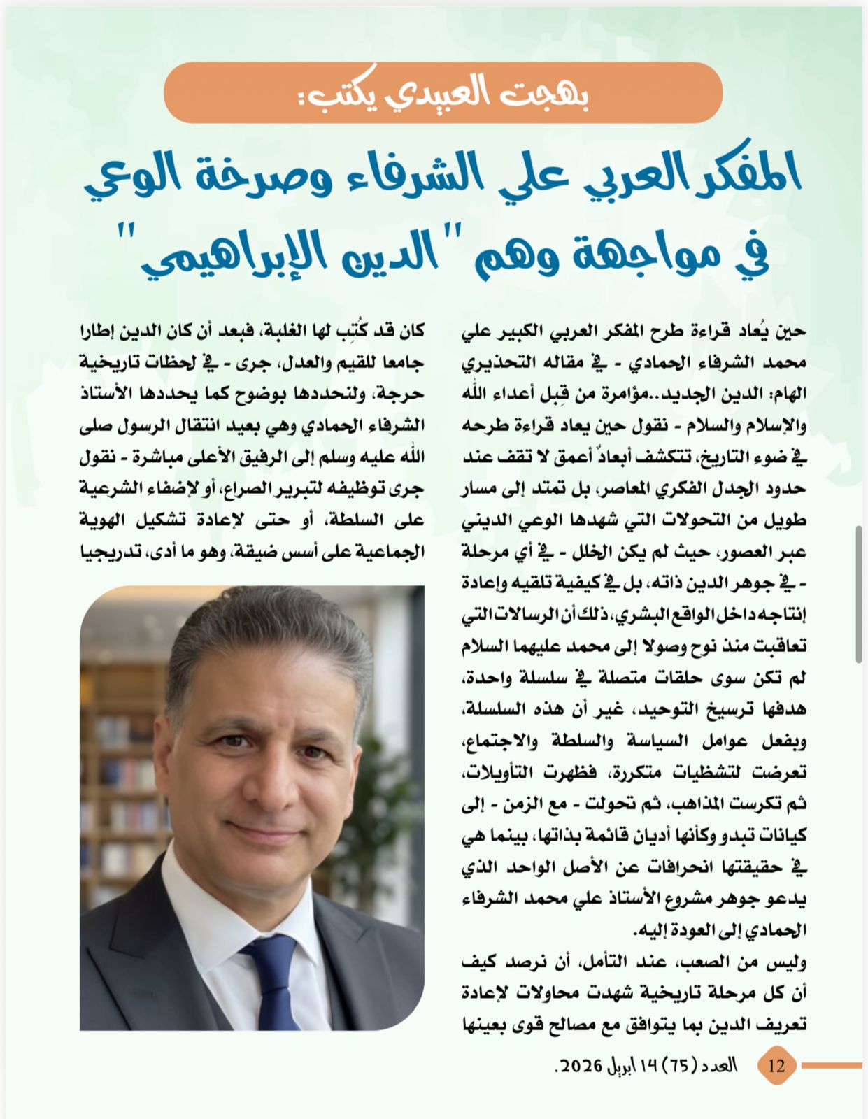 -بهجت العبيدي يكتب :المفكر العربي على الشرفاء وصرخة الوعى فى مواجهة وهم الدين الإبراهيمى