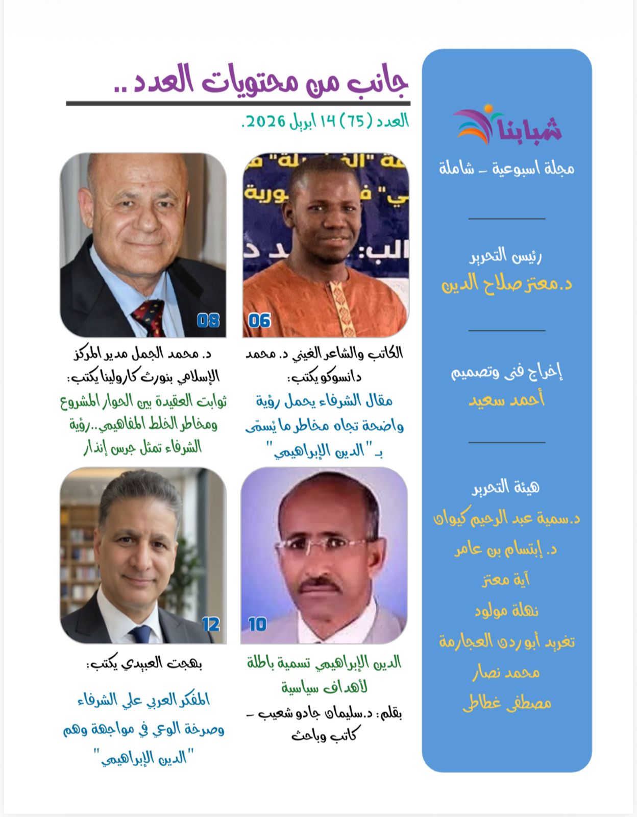 -يرأس تحرير مجلة شبابنا الكاتب الصحفي د. معتز صلاح الدين رئيس مجلس أمناء مؤسسة رسالة السلام بالقاهرة