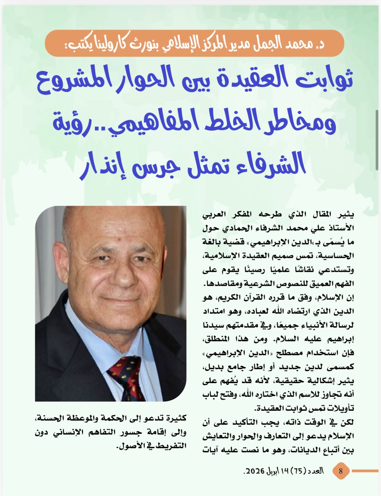-د. محمد الجمل مدير المركز الإسلامي بنورث كارولينا يكتب :ثوابت العقيدة بين الحوار المشروع ومخاطر الخلط المفاهيمي..رؤية الشرفاء تمثل جرس إنذار
